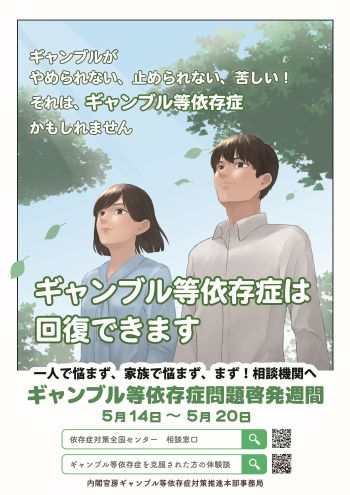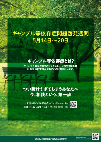 ギャンブル等依存症対策基本法において、毎年5月14日~20日はギャンブル等依存症問題啓発週間に定められています。