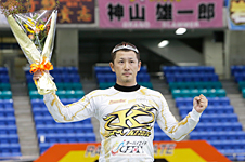 ドリームレースは前受けから7番手まで下げた深谷知広が打鐘前の2コーナーから一気の巻き返し。抵抗する脇本雄太を力でねじ伏せると人気の中部SSトリオで上位独占の態勢に。番手の金子貴志が粘る深谷を捕らえて快勝した。 「深谷は3.92にギアを軽くして、あれだけ踏めるんだから強いですね。すごい踏み出しだったし、掛かっていました。最後もタレていなかったけど差せたのはギアの差ですね。3人で決まったのが一番よかった。明日はいい休みになると思います」 深谷知広(写真)は圧巻の逃走劇で同型のライバルを圧倒。ファン投票1位に相応しい走りでスタンドを沸かせた。 「ワンツースリーが決まったのがよかったです。(脇本が)ゆっくり来るようなら突っ張ろうと思ったけど、挑んできましたからね。構えるレースはしたくなかったし、行けるところから思い切り仕掛けました。(3.92の)ギアを生かした走りはできたと思います。でも、まだ改善の余地はあるので、上積みしていきたい」 浅井康太が3着でファン投票の上位3選手で確定板を独占した。 「深谷君がすごい強くて恵まれました。金子さんもバッチリだったし、しっかり付いていくだけでしたね。調子は悪くないと思います」 池田勇人は後方に置かれて凡走した。 「叩こうと思ったら接触したり、外に浮いた選手が邪魔になったりで、バックを踏んでのレースになってしまった。何かしたかったんですけど、しょうがないですね」 単騎の石井秀治もまくり不発に終わった。 「ちょっと位置にこだわったんですけど、ちょうどバックを踏んだときに深谷君に一気に行かれてしまった」 |