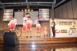 また、クリテリウムの前には恒例の「ガールズケイリンスペシャルレース」も行われました。今年は田中まい選手、明珍裕子選手、青木美優選手、蓑田真璃選手、梅川風子選手、比嘉真梨代選手、競輪学校生の坂口聖香生徒の7名が参加。レースは競輪と同様にペーサーが先頭を引いて周回、ラスト400m前後からのスプリント勝負で決着します。女子選手のパワフルなもがき合いに歓声が上がる中、先頭でゴールを駆け抜けたのは梅川選手! 学校生時代に出場した2015年大会に続き、2度目の勝利となりました。