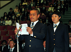 平成27年5月10日、競輪学校の講堂で113回生、114回生の入学式が行われました。瀧澤正光学校長の式辞、吉田和憲JKA会長の訓辞、来賓による祝辞の後、生徒を代表して113回生の増田仁(広島)、114回生の三尾那央子(北海道)が誓いの言葉を述べ、式は閉会しました。生徒たちは1人1人名前を呼ばれ、大きな返事をしていました。競輪学校に入った実感がしっかりと沸いたことでしょう。これから約1年の訓練を経て、大きく羽ばたいていくことを期待したいですね。