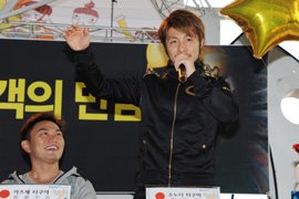 ![]() 決めポーズをしてくれたキム・ミンチョル。 「韓国の男前!」とは本人談 |