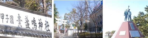 球場の正面入場門の側に、「素盞鳴(すさのお)神社」(左下と中央の写真)という読み方の難しい神社がある。鳥居の右側に見える建物が甲子園球場で、阪神タイガースの関係者も毎年「必勝祈願」しているが、去年の暮れ、北海学園大学経済学部の古林英一教授が西宮市内の我が家に来宅。競輪の資料を見ていただいた後、同神社をはじめ、市内にあった西宮、甲子園両競輪場の跡地などをご案内した。