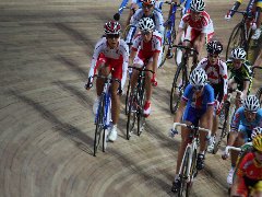 レース序盤、最初の中間スプリントではオーストラリアのダンがスプリント力を見せて5ポイントを獲得。その後次の中間スプリントまで4周以上残したところで、なんと、上野選手がひとり集団から仕掛けて飛び出します。淡々と逃げる上野選手。後続も牽制が入りなかなか差が詰まってきません。いよいよ中間スプリントというところ飛び出してきた選手1人に交わされますが3ポイントを獲得。序盤から積極的な走りを見せてくれます。4つ目の中間スプリントまで残り1周近くというところ。牽制状態の集団を見て上野選手果敢に逃げていきます。スプリントに入った集団の3人にかわされてしまいますがここでも1ポイント獲得。続く5つ目でも同様に1周前のホーム・ストレッチから発進もここは飲み込まれて0ポイント。しかし7つ目の中間ポイントではまたしても、4周以上残して一人アタック!またまた3ポイント獲得でこの時点で4位!んー頑張りますなあ。