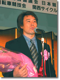 近畿経済産業局の高山課長や、京都府の山田知事等から祝辞を受け、謝辞に立った松本選手は、「第35回オールスターからの10年間は辛抱の連続でしたが、『試練は勝利の力』と信じて、精進を重ねてきた甲斐がありました。これからもスタミナ源であるスッポン料理を食べて、来たチャンスは絶対逃さないよう頑張りますので、応援よろしくお願いします」と締めくくると、会場は、GI優勝最年長記録を更新し続ける松本選手を称える暖かい拍手で包まれました。