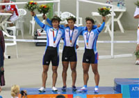 自転車・チームスプリント。1周250mの木製バンクを3人が縦1列に並びスタートする。1周するごとに先頭の選手が抜けていき、最終走者である第3走がゴールしたタイムで順位を競う。スピード、スタミナ、そして3人のコンビネーションが、勝負の鍵を握る。5月、アテネ五輪への出場権をかけた世界選手権(オーストラリア)を取材した。 日本チームは、長塚智広、伏見俊昭、井上昌己らプロの競輪選手でレースに挑んだが、体格でひと回り、いや、ふた回りほどすぐれる欧州勢には歯が立たなかった。 彼らの走りは、まるで搭載しているエンジンが違うかのようなパワーと迫力があった。それは競技としての面白味を十分に発揮していたが、日本がはたして彼らに勝てるのだろうかと考えると、絶望的にならざるをえなかった。 7位。今年ダービーを制した伏見らトップ選手をそろえた“ドリームチーム”も、アテネへの出場権を確保するのがやっとだった。 だが、レース後の選手たちが見せた表情は、意外にもサバサバとしたものだった。 「まあ、あと3カ月ありますからね」(伏見) それは悔しさや絶望感といったものではなく、むしろアテネへの手ごたえを感じさせるものだった。 7月。選手たちは本業である競輪のレースから離れ、米・コロラド州での長期合宿を張った。マラソンランナーの合宿地としても知られる、酸素の薄い高地でのトレーニングは、彼らの肉体を徹底的に鍛え直した。 コンビネーションの不安も解消された。これまでは、長塚、伏見に続くメンバーがなかなか決まらなかったため、スタートの練習を合わせることができなかった。 だが、ゲーリー・ウエスト監督が伸び盛りの井上を第3走に固定したことで、連係に不安を残していたスタートの練習を重点的にこなすことができた。 「スタートだけは、何度も、何度も繰り返し練習して、きっちり仕上げておかないと」 長塚の言葉どおり、エンジンの排気量で上回る欧州勢に勝つためには、スタートダッシュで先手を取るほか道はなかった。 アテネでの大舞台。3人は自信を深めて挑んでいた。予選はキューバとの対戦。組み合わせに恵まれた感はあったが、44秒355の日本最高記録で難なく突破する。 45秒291だった世界選手権のタイムから、1秒近くも縮めていた。生まれ変わった日本チームの走りに、スタンドの一角に陣取った日本応援団にも熱が入った。 一回戦。強豪・オランダとの対戦が決まった。全身オレンジ色で身を固めた男女が、大声で叫びながら国旗を振りかざす。 風の抵抗をもろに受けながら、圧倒的な脚力でスタートダッシュを成功させなければならない第1走は、25歳の長塚をおいて他にいない。 00年1月、若手の発掘を目的とした記録会「チャレンジ・ザ・オリンピック」で、そのすぐれた脚力が目に止まり、シドニー五輪代表の座を射止めたシンデレラボーイ。以来、日本不動のスターターとして活躍してきた。 「スタートだけは、どこの国にも負けたくない」 号砲とともに、ロケットの発射シーンを思わせるダッシュで飛び出した。1周目のラップは、17秒566。宣言どおり、参加12カ国中トップとなるタイムでコースを外れた。 長塚の爆発的なスタートに離されない脚力と、アンカーへとつなぐ持久力。要となる第2走は、チーム最年長、28歳の伏見が任される。 4年前、世界を転戦し、オリンピック出場権獲得に大きく貢献したものの、最後の代表選考会でまさかのメンバー落ち。失意のどん底まで落ちこんだ。 「みんなにとっては4年越しでも、僕にとっては8年越しのオリンピックなんです」 東北人らしい、粘りのある走りで、長塚が築いたリードを守り抜いた。 トップスピードを持続させたまま3周するスタミナが要求される第3走には、25歳の井上。高校時代には100mを10秒8で走るなど、陸上でインターハイ優勝にも輝いた実績を誇る。高校卒業後、競輪選手だった父の勧めで自転車をはじめた。 「日本の弱点は、第3走だ」との指摘を耳にした井上は、悔しさをペダルにこめた。すでに500mを全力で漕いでいるが、スピードは衰えない。伸びのある走りで、最後まで駆け抜けた。 44秒081。予選でマークした日本記録をさらに更新した。勝利チームのなかで2番目の好タイム。思いがけず、決勝進出が決まった。いままで気勢をあげていたオレンジ軍団ががっくりと肩を落とし、席に座りこむ。代わりに、会場のあちこちで日の丸が振られていた。長塚が、「もっと、もっと」と両手であおる。 ドイツとの決勝戦では惜しくも敗れたものの、3人は晴れやかな顔で表彰台に上がった。 伏見は、胸を張る。 「夢は、金じゃ買えないから」 高額賞金のレースをフイにしてまで世界の舞台にかけてきた。思いが、実った。 下馬評を覆す、あまりにも見事な走り。プロ選手としてのプライドが輝いた。 |