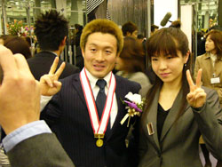 広報大賞の表彰式も行われました。 大賞には「アテネオリンピック男子チームスプリント銀メダル獲得」が選ばれ、伏見俊昭・長塚智広・井上昌己の3選手が受賞しました。3選手は、広報大賞の賞金300万円の中から150万円を新潟県中越地震復興の義援金として日本赤十字社を通し被災地へ寄付することを発表しました。 優秀賞には、テレビ番組「トップランナー 長塚智広」・少年チャンピオン連載中の「輪道」・ポスター「第55回高松宮記念杯競輪」が選ばれました。 |