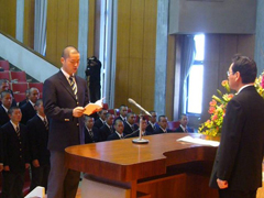 大池校長の式辞、会長訓辞、来賓祝辞、在校生を代表して戸伏 康夫(トブセ ヤスオ・岡山)の歓迎の辞に続き、新入生を代表して兵動 秀治(ヒョウドウ ヒデハル・広島)が誓いの言葉を述べて終了しました。 |