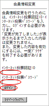 3 インターネット投票認証ID・パスワードの入力 (1) 「インターネット投票認証ID」および「インターネット投票パスワード」を入力します。 すでにログインしている状態でも、「会員認証」画面が表示されますので、 「インターネット投票認証ID」および「インターネット投票パスワード」を入力します。 (2) 「ログイン」ボタンを押します。 4 投票メール設定画面の表示 「投票メール設定」ボタンを押します。 |