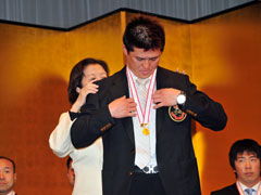 寛仁親王殿下のご臨席がないことがとても寂しいものの、春めいていい陽気の中で優秀選手表彰式典を行えることをとても誇りに思うとの財団法人JKA会長 下重暁子の主催者挨拶のあと、受賞選手の表彰が行われ、最優秀選手賞を受賞した村上博幸選手には、栄誉あるチャンピオンブレイザーが贈呈されました。 |