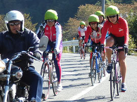 教官がオートバイで先導し、男女各4班に編成された生徒達が自転車で続きます。街道練習で公道を使用する際の注意事項や交通ルールを体得します。