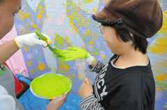 9色の競輪カラーを基調とし千葉大学の学生がデザイン・下絵を担当し、かしの木園、でい・さくさべの方々が、手形でペイントしました。参加者は皆楽しそうで笑顔あふれる作業となりました。作業中、通りかかった人からも『すごい』『格好良い』など反響がありました。千葉競輪場にお越しの際は是非じっくり見て、壁画の大きさを実感して下さい! お待ちしております。