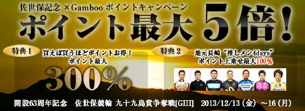 「電投で買っておトクに現金キャッシュバック」(対象7競輪場)でお馴染みの「Gambooポイント」では、佐世保競輪場にて12月13日(金)~16日(月)に開催される「開設63周年記念佐世保競輪九十九島賞争奪戦」を対象に、『ポイント最大5倍!佐世保記念×Gambooポイントキャンペーン』を実施します。 [キャンペーン概要] 2013年12月13日(金)~16日(月)に佐世保競輪場で開催される「開設63周年記念佐世保競輪九十九島賞争奪戦」の車券を購入して頂くと… [最大300%上乗せ!!!購入金額に応じてポイント上乗せプレゼント] 4日間合計の車券購入金額に応じて、ポイントを上乗せしてプレゼント! 4日間で30万円以上購入して頂くと、なんとポイント300%上乗せいたします! [長崎“推しメン4days”ポイント最大100%上乗せ!!!](GambooBET限定) 出場予定の地元長崎の7選手の中から「あなたの“推しメン”を1名選んで、その選手を追いかけて頂く」という企画です。 あなたの“推しメン”が出場するレースを2日間以上購入して頂くとポイントを上乗せいたします。 全4日間すべて購入して頂くと、なんとポイント100%上乗せいたします!!! ※本キャンペーンに参加するには、エントリーが必要です。 ※詳しくは、下記のキャンペーンページをご覧ください。 《『ポイント最大5倍!佐世保記念×Gambooポイントキャンペーン』について》 http://gamboo.jp/topics/_/tid/--20131213sasebo 《Gambooの登録はこちらから》 http://gamboo.jp/