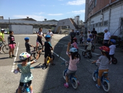 | 7月12・13日の二日間、松戸競輪場において自転車に乗れない子供たちのための自転車教室が行われました。 指導員には自転車安全整備士・自転車技士・自転車コーチの資格を持つ高田敏広選手(東京・67期)と五味実さん(元選手・東京・52期)、そしてアシスタントコーチとしてガールズケイリンの浦部郁里選手(千葉・102期)を迎え、炎天下の中、熱中症に気をつけながら両日10名の子供たちが元気に補助輪無し自転車にチャレンジしました。 教室終了後に感想を聞くと子供たちから「最初は怖くて泣いちゃったけど、今はうまく乗れるときもあるよ!」、「(ガールズの)お姉さんが先生だったので優しくて良かった。」と、汗を流しながら笑顔で答えてくれました。 また、親御さんたちからは「こんなにも乗れるようになるとは思わなかった。」、「親の言うことはまったく聞かない子なのに、競輪選手の先生だと素直に頑張っていて、ビックリしました。」等の感想の声があがりました。